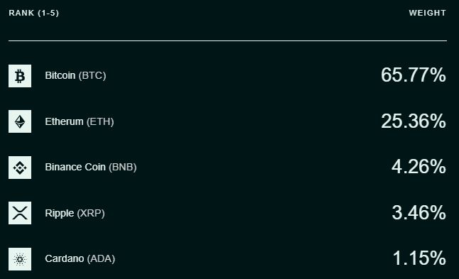 Cryptocurrencies are ranked by market capitalization on the last business day of every month. The top 5 cryptocurrencies are then weighted by market capitalization with no cap or floor and then included with their respective weights in the index.